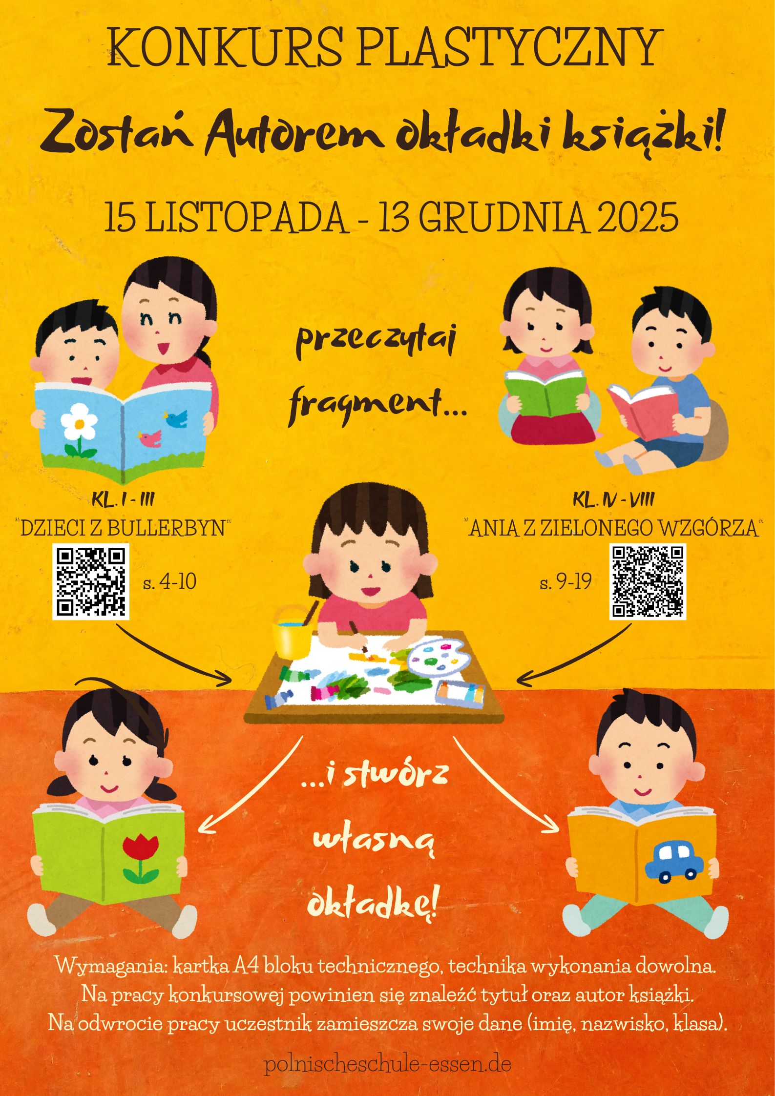 Uczniów klas I - III zachęcamy do przeczytania fragmentu książki "Dzieci z Bullerbyn" autorstwa Astrid Lindgren. Wykonania okładki tytułowej książki (nie zapomnijcie umieścić na waszej okładce autora i tytuł książki jaką prezentujecie). Prace plastyczne wykonane techniką dowolną w formacie A4 oddajemy do 13 grudnia 2025 r.